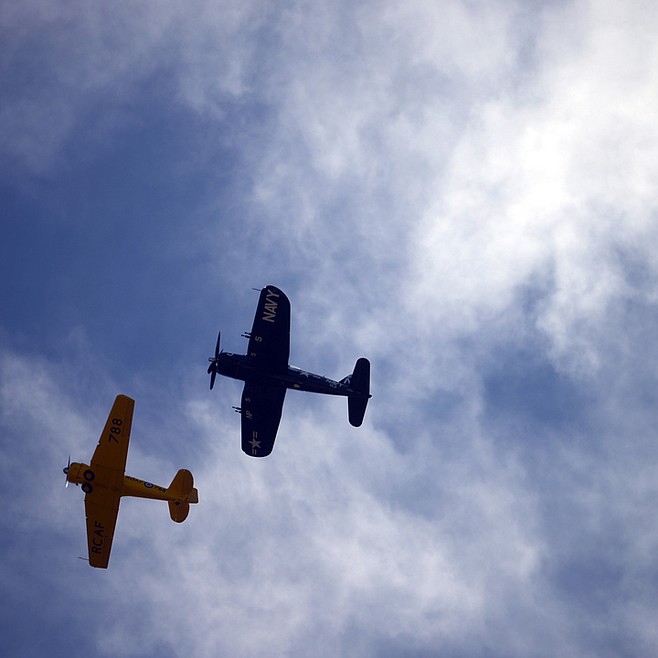 A Navy Corsair and a Canadian Harvard, known as a T-6 when part of the U.S. military, buzz downtown in the Fourth of July Parade in downtown Kalispell on Friday, July 4. (Brenda Ahearn/Daily Inter Lake)
