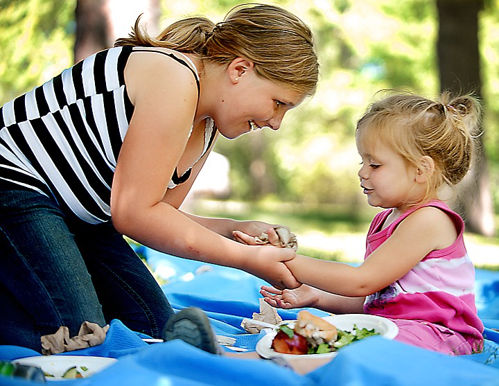 Kyleigh Rogers, 11, wipes the hands of her cousin Nathalie Rogers, 3, after a picnic in the Woodland Park on Monday, July 3, in Kalispell. (Brenda Ahearn/Daily Inter Lake)