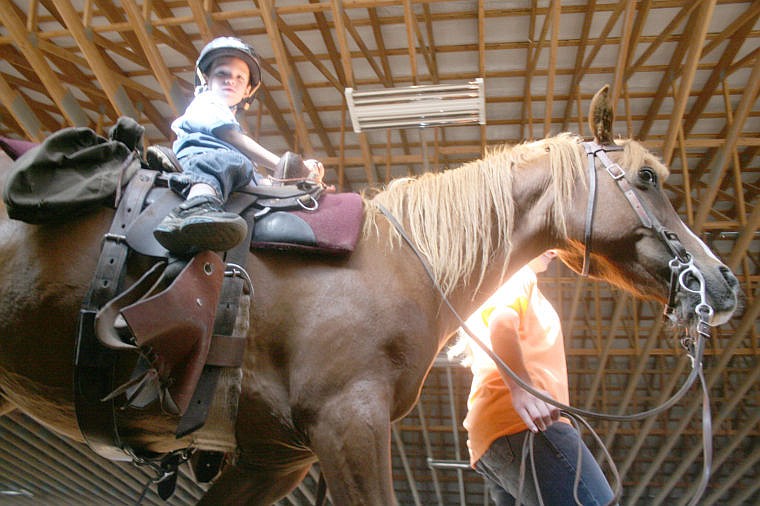 Vincent Temple, seated above on a horse, gets a ride led by Mary Grace Donally at the Tarkio Equestrian Center on Wednesday.