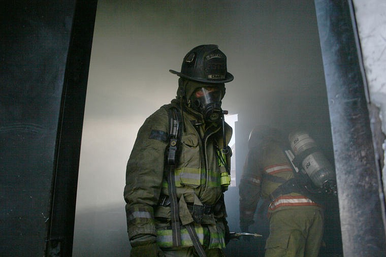 Craig Jeppson with the Montana State University Extension Fire Training Program emerges from the smoke-filled burn trailer.