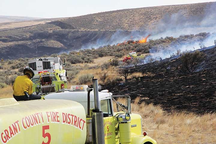QUINCY - Firefighters from Grant, Douglas and Chelan counties were able to knock down an 800-acre fire along state Route 28 near Quincy, but flare-ups kept crews on scene throughout the day.