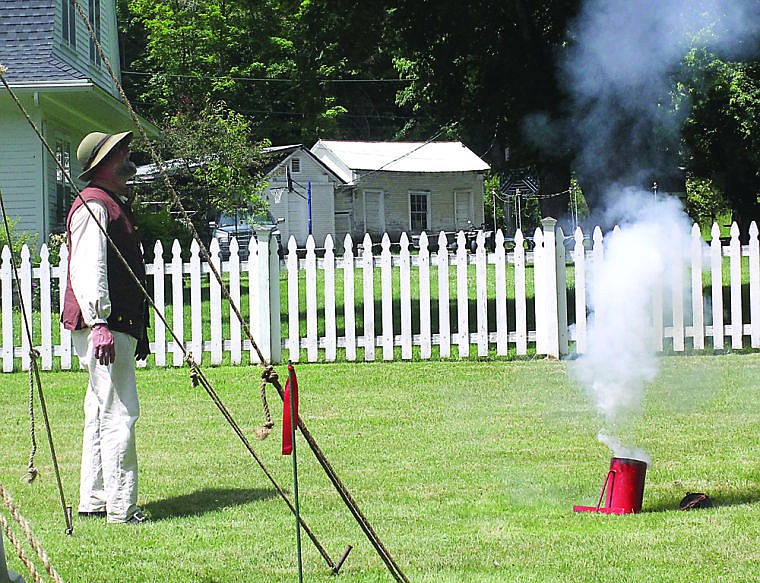 Mike Tomell fires off a candy cannon for the children in attendance at Saturday's fur trader era event.