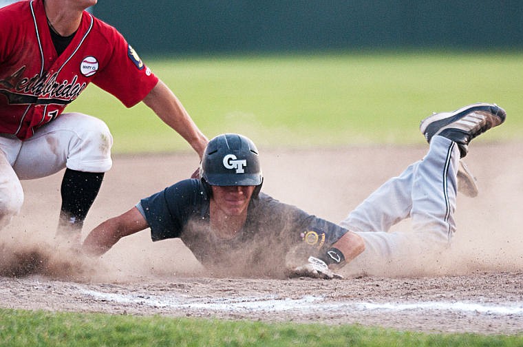 Glacier base runner Tyler Murphy (right) slides in safely to third base Friday night during the Twins loss to Lethbridge on the second day of the Sapa-Johnsrud Memorial Tournament at Memorial Park in Whitefish. (Patrick Cote/Daily Inter Lake)