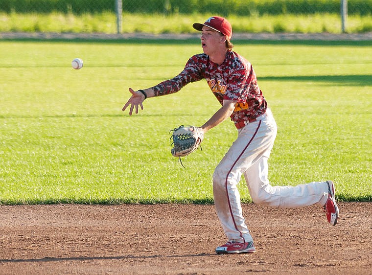 Kalispell second baseman (28) flips the ball to second base for an out Saturday evening during the Lakers game against Vauxhall in the John R. Harp tournament at Griffin Field in Kalispell. (Patrick Cote/Daily Inter Lake)