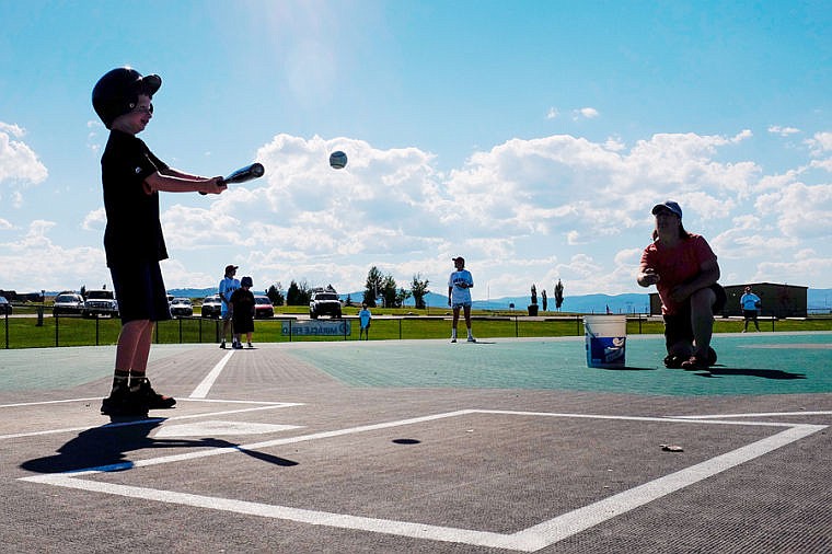 Jennifer Johnson, right, pitches the ball Tuesday afternoon during a baseball game at Miracle Field at Kidsports Complex in Kalispell. July 8, 2014 in Kalispell, Montana. (Patrick Cote/Daily Inter Lake)