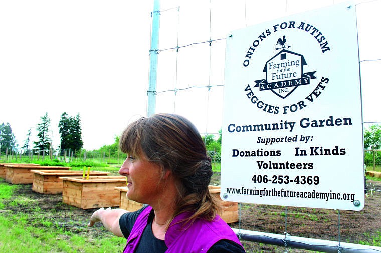 Farming for the Future Executive Director Sherry Lewis-Peterson points to raised beds at the "Onions for Autism, Veggies for Vets" community garden at the Montana Veterans Home in Columbia Falls.