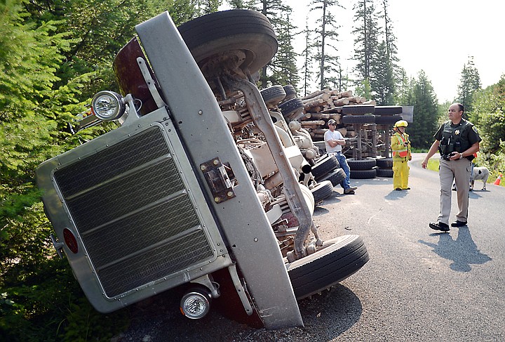 Jerril Ren of the Montana Highway Patrol examines the scene of a logging truck rollover on Wednesday morning, July 16, on the west shore of the Hungry Horse Reservoir. In the background are members of the Martin City Volunteer Fire Department. (Brenda Ahearn/Daily Inter Lake)