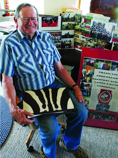Larry Passmore sits in front of photo displays of students from the MaaSAE Girls Lutheran Secondary School in Tanzania. He holds a zipper binder made of zebra skin, a gift from staff at the school during one of his seven trips to the country. Passmore has made donations to the school for 20 years. (Hilary Matheson/Daily Inter Lake)