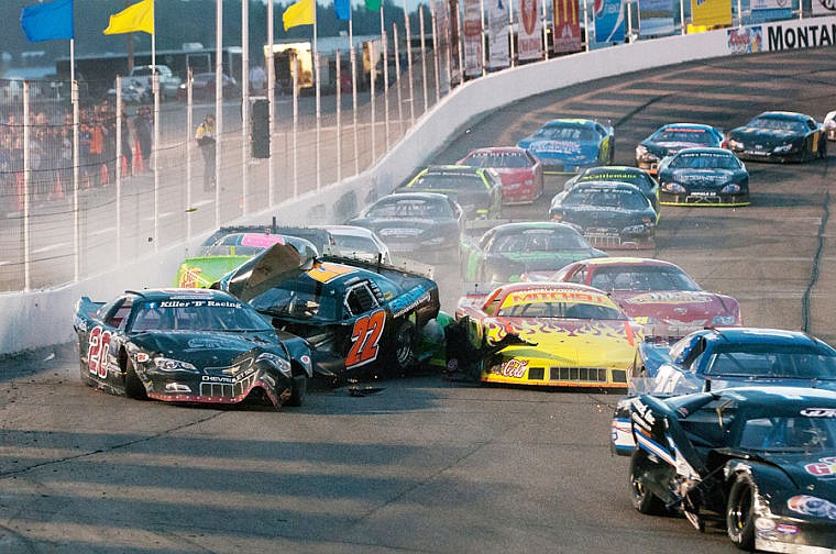 Cars collide during a restart on the tenth lap Saturday night during the Montana 200 at Montana Raceway Park in Kalispell. Six cars were involved in the wreck but no one was injured. July 19, 2014 in Kalispell, Montana. (Patrick Cote/Daily Inter Lake)