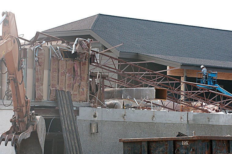 A worker continues construction on the new building in the background as the A wing of Whitefish High School is demolished on Thursday.