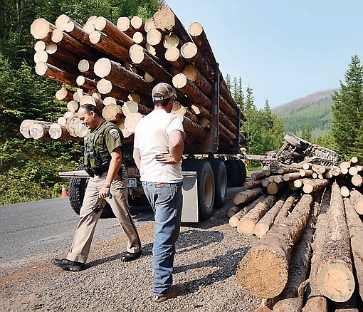 The truck cab and lead trailer tipped over near the Lost Johnny Point Campground, spilling logs on the side of the road. The second trailer remained upright on the paved roadway.