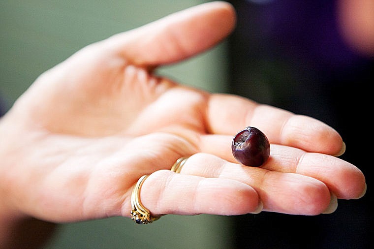 Supervisor Shauna Clevidence holds out a large huckleberry Thursday morning at the Huckleberry Patch in Hungry Horse. July 24, 2014 in Hungry Horse, Montana. (Patrick Cote/Daily Inter Lake)