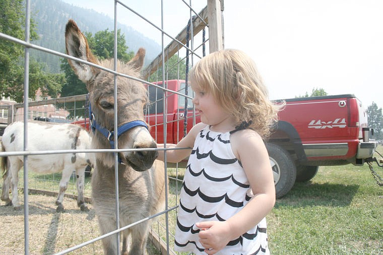 Zoe Fisher makes a new friend during the Railroad Day celebration on Saturday.