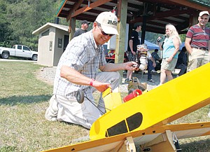Norm Crum loads the bomb bay of his Telemaster RC plane in preparation for the candy drop Saturday during the second annual Kootenai RC Flyers Fun Fly. "Bombs" away!