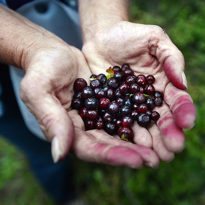Lynn Taylor of Bigfork, holds out a handful of quickly gathered berries on Thursday, July 24, in Ferndale. (Brenda Ahearn/Daily Inter Lake)