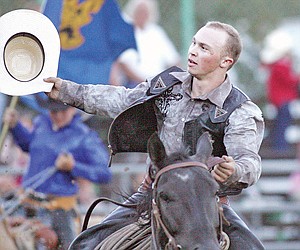 Tyrell Smith of Great Falls takes a victory lap for his 90 point ride aboard "Hoot Wine" in the saddle bronc event.