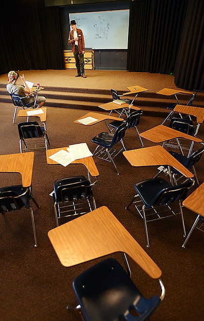 Aspen Kennedy, who will be a freshman next year at Flathead, practices under watch by camp councilor Ethan Hall, a Flathead junior, on Wednesday, July 23, at the middle school speech and debate camp at Flathead High School. (Brenda Ahearn/Daily Inter Lake)
