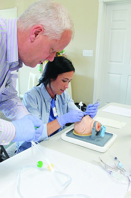 Gregory Hanson, the CEO and president of Clark Fork Valley Hospital, walks medical resident Nicole Russell through the correct process of how to intubate a young child.