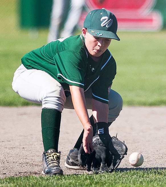 Whitefish short stop Jackson Cripe fields a ground ball Saturday morning during a semi-final game in the Cal Ripken tournament at Lee Field at Kidsports Complex in Kalispell. July 26, 2014 in Kalispell, Montana. (Patrick Cote/Daily Inter Lake)