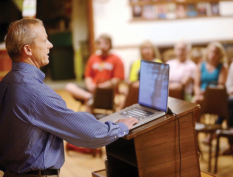 Retired Green Beret Master Sergeant Mark Vomund speaks to the crowd gathered for his talk "From Soldier to Survivor" on Wednesday, July 23, in Whitefish. The event was sponsored by the Whitefish Veterans Support Team. (Brenda Ahearn/Daily Inter Lake)