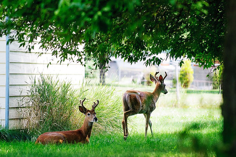 Two whitetail bucks in a yard Monday afternoon off South Woodland Drive in Kalispell. July 28, 2014 in Kalispell, Montana. (Patrick Cote/Daily Inter Lake)