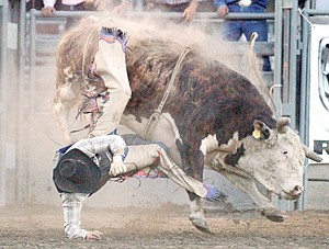James Warfield of Helena exiting the bull known as "Silver Lashes" Saturday.