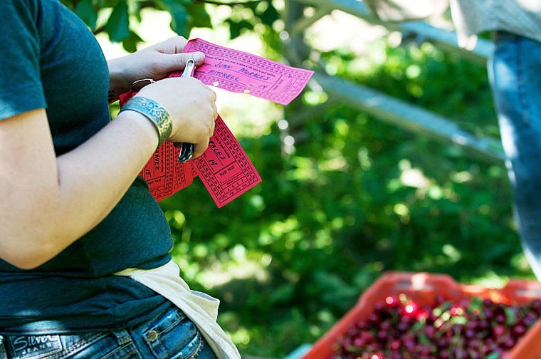 Katrina St. Sauver counts boxes of cherries and marks a punch card Tuesday morning at Mitchell Orchard along Flathead Lake near Yellow Bay. July 29, 2014 in Yellow Bay, Montana. (Patrick Cote/Daily Inter Lake)
