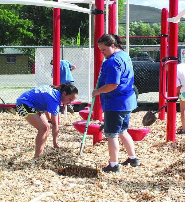 Sidney Jackson helps her mother Carmen distribute wood chips around the new playground at Hot Springs Elementary School.