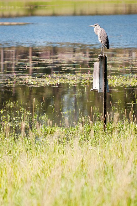 A great blue heron perches atop a post Tuesday afternoon in a pond near Woods Bay.