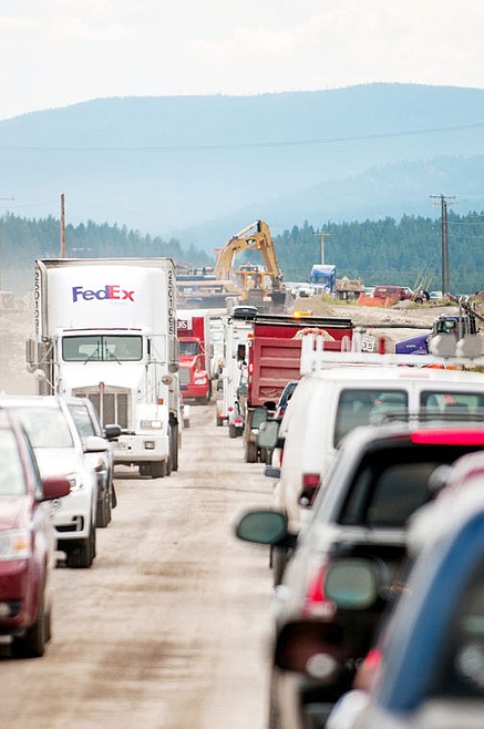 Traffic backs up as construction continues Wednesday afternoon on U.S. 2 west of Kalispell. July 30, 2014 in Kalispell, Montana. (Patrick Cote/Daily Inter Lake)
