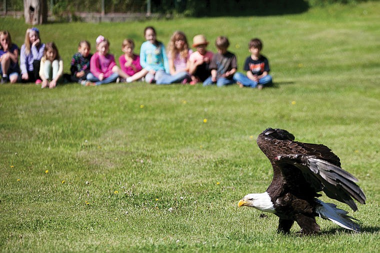 Fair-Mont-Egan students watch as a bald eagle is released back into the wild Monday, June 2, after being rehabilitated at Wild Wings Recovery Center east of Kalispell. (Patrick Cote/Daily Inter Lake)