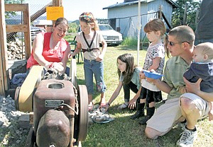 Mary Davis, left, demonstrates the operation of the assayer's crusher to Haugen family members Mercedes, Airyana, Elena, Brandon and William Saturday during opening day at the Heritage Museum. The crusher is powered by an International Harvester 2-1/2 hp water-cooled one-cylinder engine.
