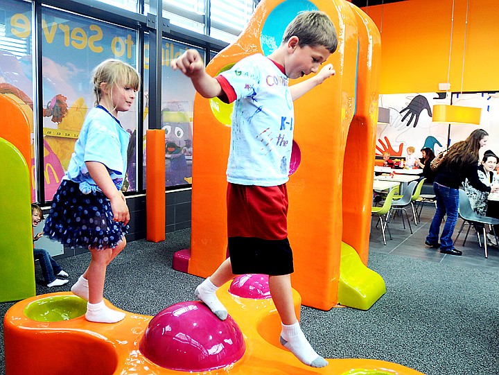 Conner Salmonsen and Emily Higgs of Katie Mackin's kindergarten class are among the first to be granted access to the new Playland at the McDonalds in Evergreen on Tuesday, June 3. (Brenda Ahearn/Daily Inter Lake)