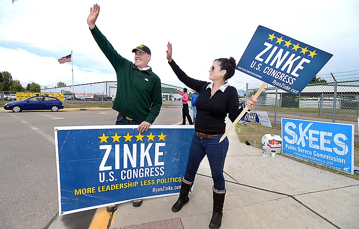 Ryan Zinke and his wife, Lolita, wave to passing cars and voters outside the Flathead County Fairgrounds on Tuesday in Kalispell. Zinke won the GOP nomination for U.S. House. (Brenda Ahearn/Daily Inter Lake)