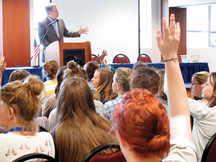 Participants in the American Legion Auxiliary Girls State gathering ask U.S. Rep. Steve Daines questions in Helena on Monday, June 2, 2014. Daines won the GOP U.S. Senate primary on Tuesday. (AP Photo/Matt Volz).