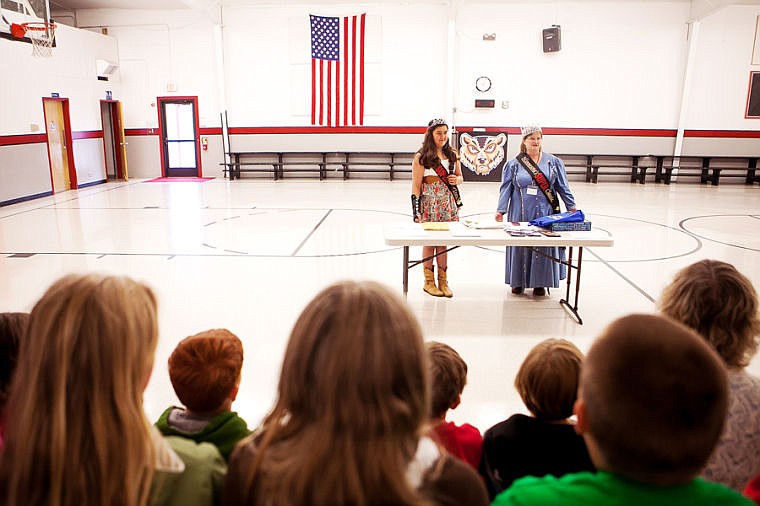 Connie Jones and her granddaughter Esmerelda Ramos give a presentation about seatbelt safety Wednesday morning at Smith Valley School. June 4, 2014 in Kalispell, Montana. (Patrick Cote/Daily Inter Lake)