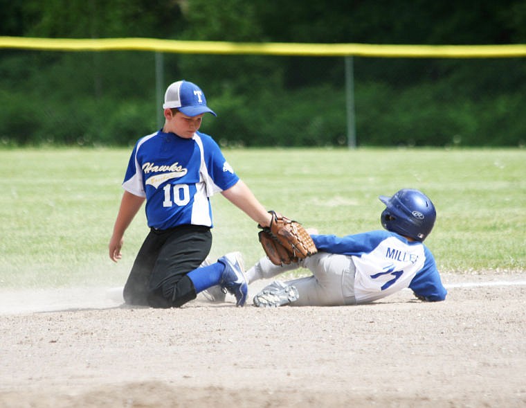 Superior baserunner Issac Miller slides safely into third base, beating the tag by Thompson Falls infielder Bradley Sieben.