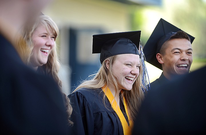 From left, Annalise Pierson, Danielle Stoner and David Willis share a laugh before the annual prayer circle prior to the Stillwater commencement ceremony on Friday, June 6, in Kalispell. (Brenda Ahearn/Daily Inter Lake)