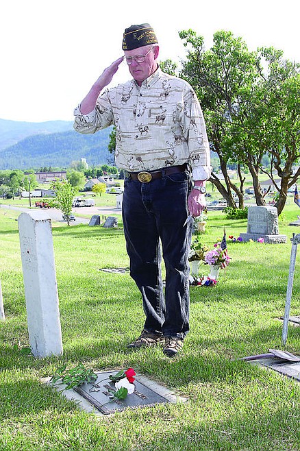 Don Kunzer salutes a fallen soldier after symbols of remembrance were placed on the grave.