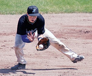 Third baseman Dylon Lane fields a grounder and with a throw to Austin Marshall at first, retires the sides top of the sixth inning vs. Kalispell A. Loggers prevail 5-4 in first game of a doubleheader Sunday.