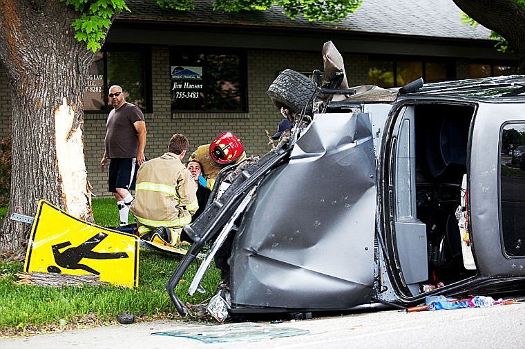 Kalispell firefighters check out a man after his truck crashed into a tree Thursday afternoon at 10th Street and South Main. The man sustained minor injuries and was not transported to the hospital.