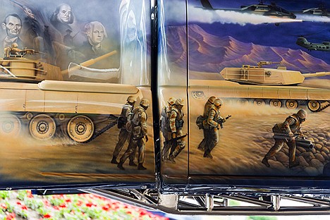 Various military campaigns throughout history and iconic images come to life on the truck's fenders and doors. George Washington can be seen crossing the Potomac. Colin Powell is seen speaking to the troops. The famous image of a World War II sailor kissing his girl is there too.