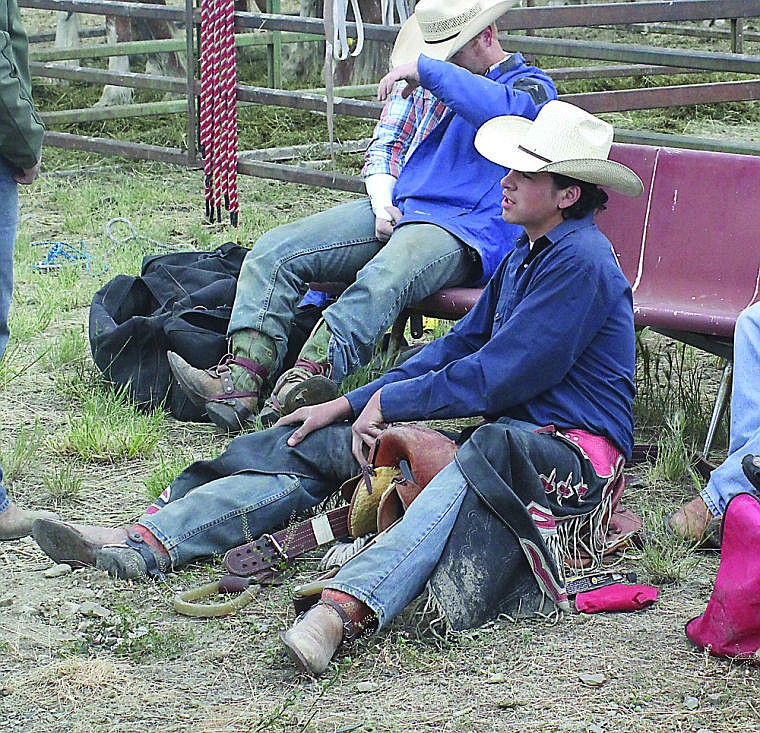 Rider Kolby Kittson prepares his equipment for the saddle bronc riding event on Saturday night.