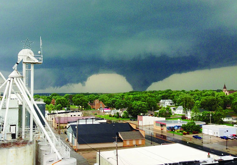 This photo taken on June 16 from atop the Wisner, Neb., grain elevator and made available on Tuesday, June 17, 2014, shows a tornado approaching Pilger, Neb. A storm packing rare dual tornadoes tore through northeast Nebraska, crumpling grain bins and flattening dozens of homes.