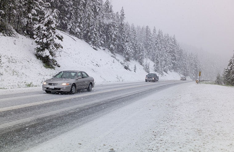Vehicles head down snowy Marias Pass near Skyland Road on U.S. 2 on Tuesday. The National Weather Service is predicting 15 to 20 inches of snow above 7,000 feet and possible flooding in the valleys. (Chris Peterson/Hungry Horse News.