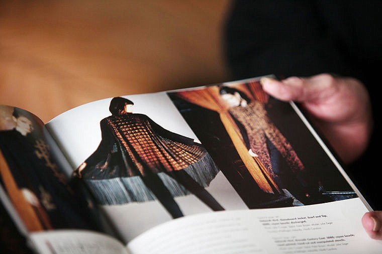Deb Newell shows off a book featuring her clothing. June 16, 2014 in Lakeside, Montana. (Patrick Cote/Daily Inter Lake)
