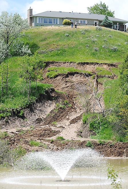 Parts of the hillside above Village Greens in Kalispell slid into a pond below on Thursday morning.