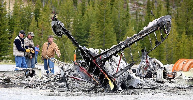Federal investigators look over the wreckage of a Grumman Goose airplane that crashed late Tuesday afternoon in the Lost Trail Ski Area parking lot, Wednesday near Sula. A twin-engine airplane plane crashed and caught fire in the parking lot of a western Montana ski area, killing the pilot.