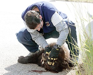 Wildlife biologist Tonya Chilton Radandt checks over the cub bear hit and killed by a car June 16 on the Kootenai River bridge at Libby.