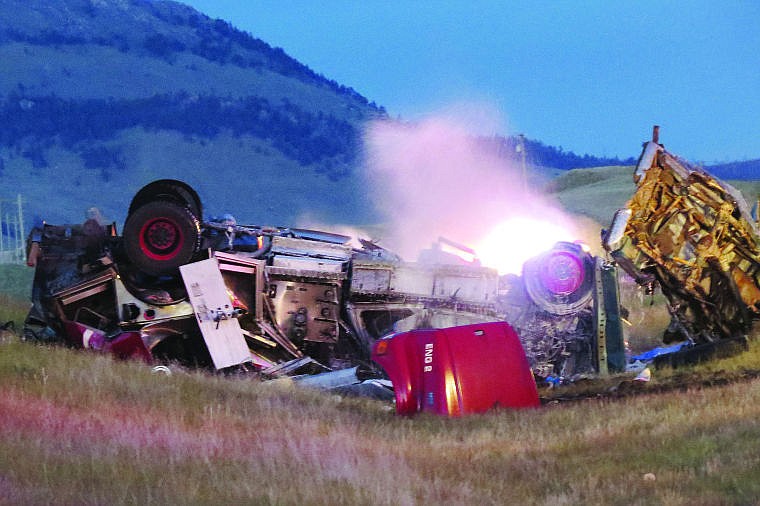 A vehicle is on fire following a two-vehicle crash on Thursday near Helena. A fire engine and a pickup truck collided on the highway in southwestern Montana, causing an explosion and fire that killed six people, including a fire chief and three Helena children. There were no survivors. A Three Forks fire engine heading east on U.S. 12 collided with a westbound pickup Thursday night, about 10 miles east of Helena, forcing both vehicles into the ditch, Jefferson County Sheriff's Deputy Bob Gleich said.